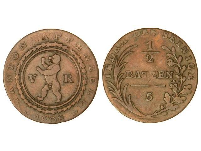 WORLD COINS: SWISS CANTONS - 1/2 Batzen. 1808. APPENZELL. Ve. KM-5. MBC-.