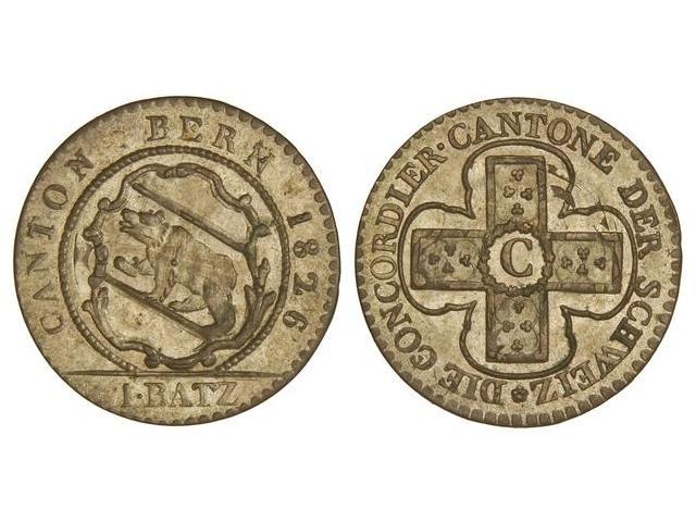 WORLD COINS: SWISS CANTONS - 1 Batzen. 1826. BERNA. Ve. Acuñada sobre otra moneda. KM-194.1. EBC-.