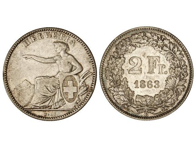 WORLD COINS: SWITZERLAND - 2 Francos. 1863-B. BERNA. AR. KM-10a. MBC.