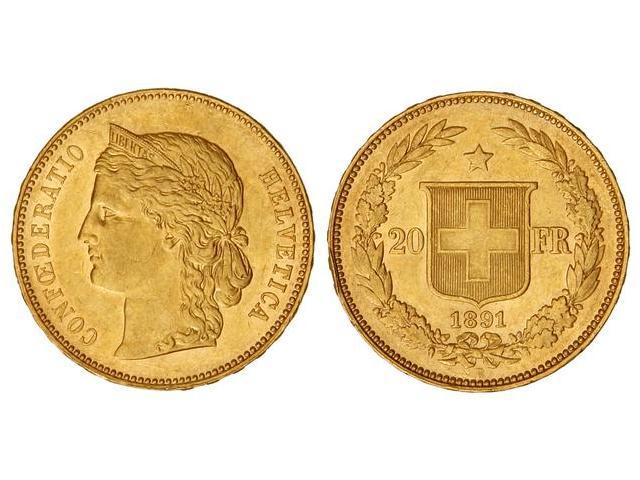 WORLD COINS: SWITZERLAND - 20 Francos. 1891-B. AU. (Leves golpecitos). KM-31.1. EBC/EBC-.
