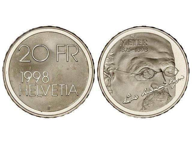 WORLD COINS: SWITZERLAND - 20 Francos. 1998. AR. Muerte de D.C. Meyer. KM-84. PROOF.