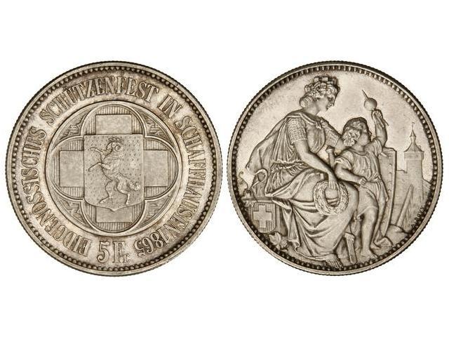 WORLD COINS: SWITZERLAND - 5 Francos. 1865. FESTIVAL DE TIRO: SCHAFFHAUSEN. AR. Helvetia sentada con un niño, delante de un escudo. X-S8. EBC+/EBC.