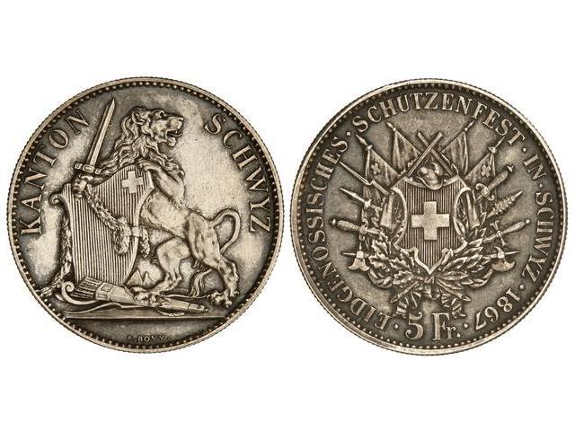 WORLD COINS: SWITZERLAND - 5 Francos. 1867. FESTIVAL DE TIRO: SCHWYZ. AR. Pátina. (Leves rayitas en anverso). X-S9. EBC.