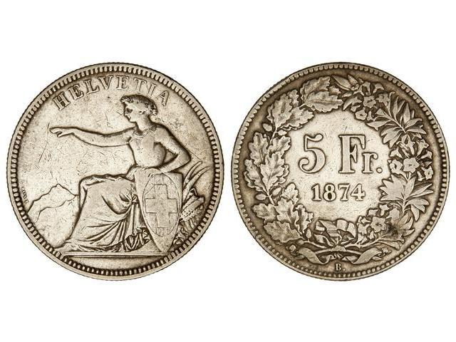 WORLD COINS: SWITZERLAND - 5 Francos. 1874-B. AR. Helvetia sentada. KM-11. MBC.