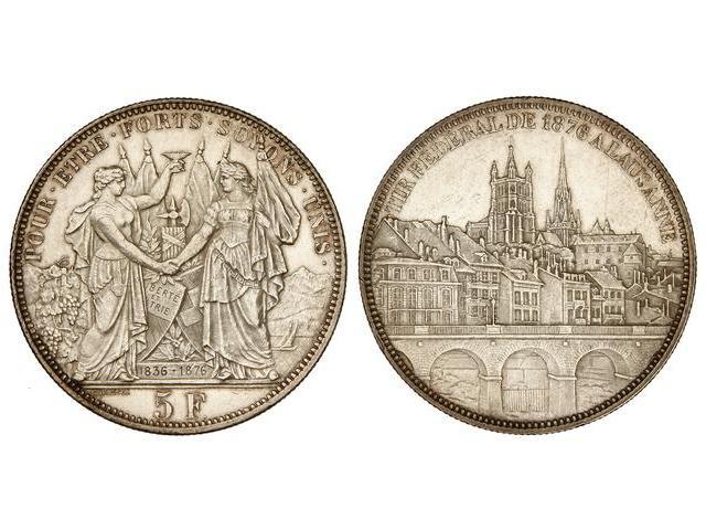 WORLD COINS: SWITZERLAND - 5 Francos. 1876. FESTIVAL DE TIRO: LAUSANNE. AR. X-S13. EBC.