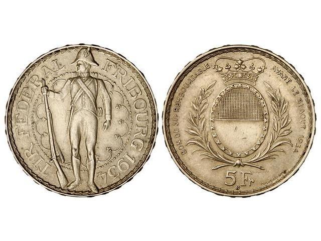 WORLD COINS: SWITZERLAND - 5 Francos. 1934-B. FESTIVAL DE TIRO: FRIBOURG. AR. KM-S18. EBC-.
