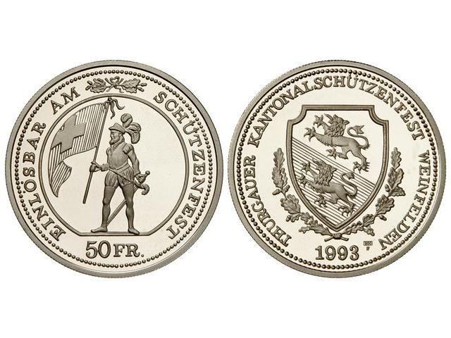 WORLD COINS: SWITZERLAND - 50 Francos. 1993. FESTIVAL DE TIRO: WEINFELDEN. AR. Tirada: 2.000 monedas. Con certificado. KM-S42. PROOF.