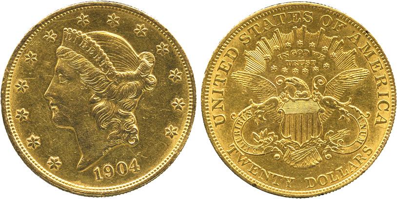 WORLD COINS. UNITED STATES OF AMERICA. Gold 20-Dollars, 1904, Philadelphia, 33.41g (F 178)