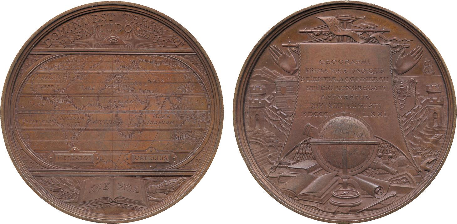 WORLD MEDALS. BELGIUM. Geographical Congress, Antwerp, Copper Medal, 1871, by H Meyer and F Baetes, global map after Mercator and Ortelius, rev legend on sail, emblems of exploration all around, 61mm. A handsome medal, extremely fine.