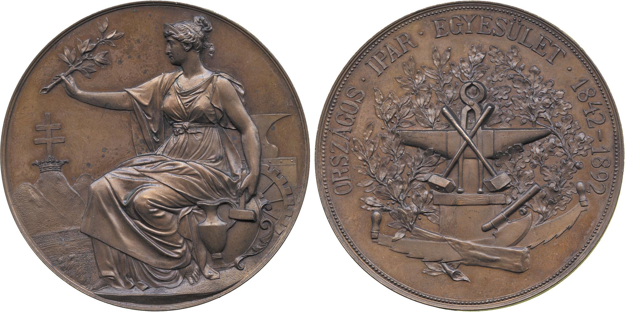 WORLD MEDALS. HUNGARY. National Enterprise, 1842-1892, large Copper Medal, unsigned, female figure seated by cog and anvil, holds olive branch, rev emblems of wood and metal-working against oak and olive branches, 85mm. Extremely fine.