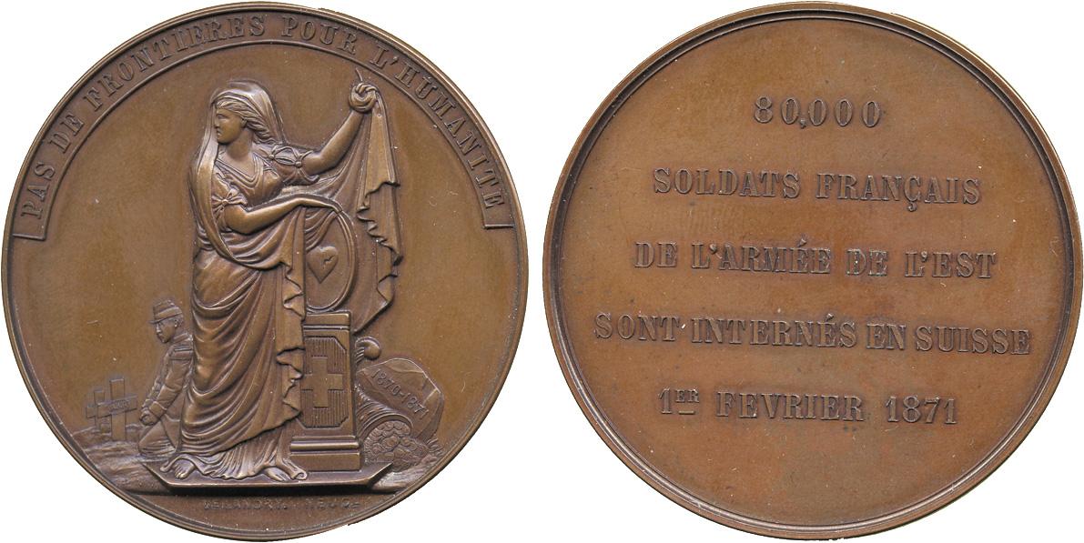 WORLD MEDALS. SWITZERLAND. Franco-Prussian War, The Internment of 80,000 soldiers of the French Army of the East, Copper Medal, 1871, by U Landry, Helvetica stands, shielding heart on altar, behind a soldier kneels at grave, rev 80,000 SOLDATS FRANÇAIS ... SONT INTERNÊS EN SUISSE, 50mm (BDM III, 293). Extremely fine.