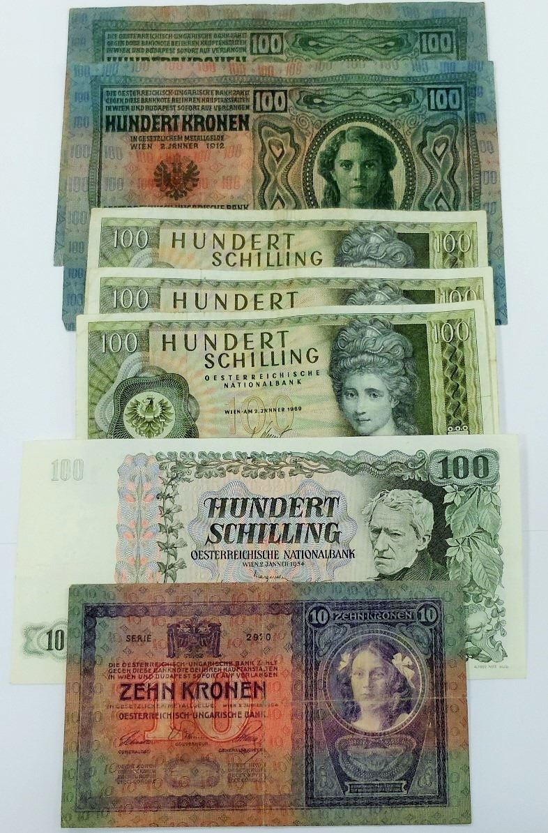 1X100 SCHILLING 1954, 1X 10 KRONEN 1904, 2X 100 KRONEN 1912, 3X100 SCHILLING 1969. MIXED GRADES, 7 PCS