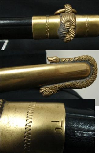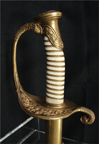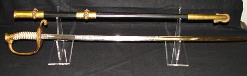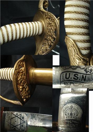 WORLD WAR 2 U.S. NAVAL OFFICER’S SWORD. Documented owner was (Dr.) Captain Emanuel Joseph Amoury of Staten Island, New York. Dr. Amoury was a surgeon in civilian life and a medical officer in his military life. Has unique brass hilt with pierced leaf and acorn motif. The letters “USN” are visible on the underside of the counter-guard. Quillon terminates in a dolphin fish head. Top of knuckle-bow is decorated with dolphin fish. Top of pommel features an eagle surrounded by 13 stars. Blade is ornately decorated with floral motifs and anchor and shield. Reverse of blade is decorated with floral motifs, anchor, rope, and marked “U.S.N.” Blade is stamped at ricasso “Made in U.S.A.” with etched Star of David. Reverse side of ricasso is etched with crown and marked “A Regal Product by Gaunt”. Black leather scabbard has brass mounts and tip. Brass mounts are feature twisted rope decoration and drag is decorated with figural dolphin fish. Total length: 34 7/8”, Blade length: 29 5/8”