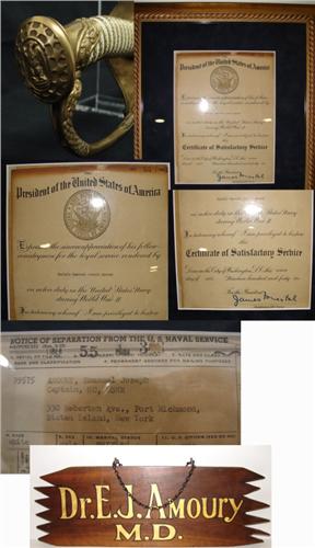 Sword is accompanied with a Certificate of Satisfactory Service from the Secretary of the Navy as well as a Notice of Separation from the U.S. Naval Service dated April 19, 1948. Both are beautifully double-framed and matted in single frame. Sword is also accompanied with a hanging office sign that reads “Dr. E.J. Amoury/M.D.”.