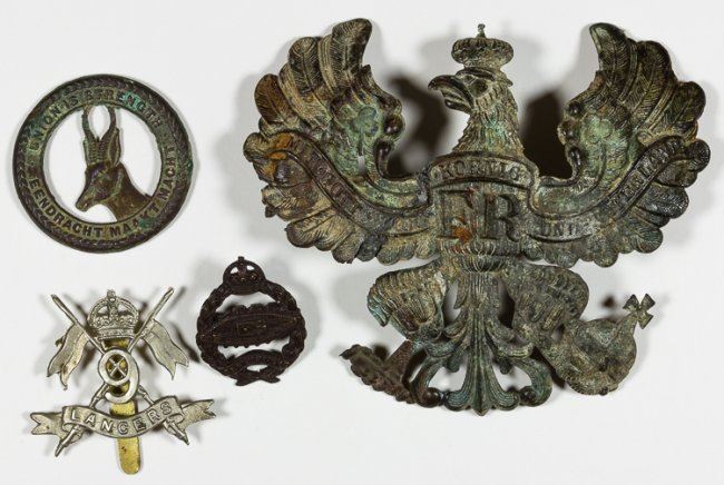 Lot of three pieces of insignia dug by an American official of the Office of Homeland Security employed at Brussels and a "digger" in his spare time. Includes a Prussian officer's shield from a pickelhaube, a 1st South Africa Infantry Regiment badge, a British 1st Tank Regiment badge, and a (non-dug) 6th Lancers badge. Very good.