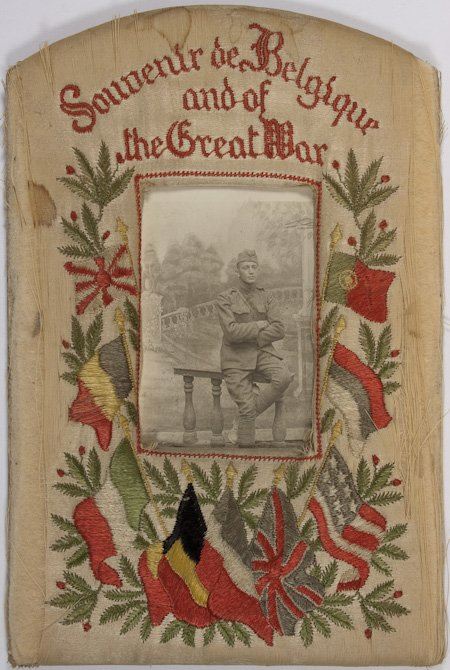 Photograph, 3" x 5" b/w showing a self-assured American soldier leaning against a railing in a studio, encased in a padded frame embroidered "Souvenir de Belgique and of the Great War" with embroidered flags of various nations at bottom. Edges missing some fabric, uncommon.
