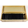 Wooden box containing 46 b/w 3 1/4" x 3 1/4" glass lantern slides. Photographs depict soldiers in trenches, battlefield views and front line activity. Slide markings and period label on box state that this collection is "Serie II". Very good.
