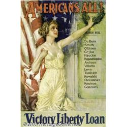 <B>Americans All! (Forbes, 1919)</B></I> WW I Poster (27" X 39"). Woman holding wreath with flag behind. The honor roll lists names representing a variety of different nationalities. Its designer, Howard Chandler Christy (1873 - 1952) was at the height of his fame. He earned his spurs as a wartime artist when he accompanied U.S. troops to Cuba in 1898, an experience that stood him in good stead when he was called on to create his famed series of patriotic WWI posters. Fine/Very Fine condition.