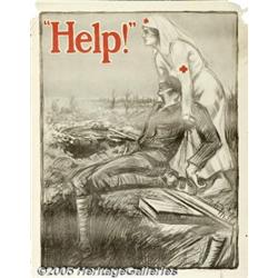 <B>Help - Red Cross (Atlantis Press, The- Boston, 1918)</B></I> WWI Poster (20" X 27.5"). Red Cross nurse with wounded man. Little is known about the artist for this poster. Though it appeared in 1918 and is often attributed to John Mills, it is believed Mills died in 1917. Of the large number of Red Cross posters produced during WWI, this uncommon example's naive style contributes to its message of urgency. Fine.