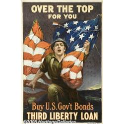 <B>Over the Top For You: Third Liberty Loan (Ketterlinus, Philadelphia, 1917)</B></I> WW I Poster (20" X 30"). Depicted: Youthful soldier, largely surrounded by a U.S. flag, advancing toward the viewer. The poster artist is Sidney H. Riesenberg (1885 - 1971), who was born in Chicago, but moved to New York early in his career. He is noted as both an illustrator and painter and did covers and interior work for such magazines as Harpers, Scribners, Collier's and The Saturday Evening Post. His paintings were mainly western genre works and his original oils are highly sought after as of late and have been setting record prices at recent auctions. It is thought he reached his peak as an illustrator during WWI, inspired by the war effort. His major works include "Remember The Flag of Liberty" (the famed immigrant 3rd Liberty Loan poster) and "Civilians All". Small chips and minor tears along border, otherwise the poster is in near pristine condition. Very Fine+ condition.