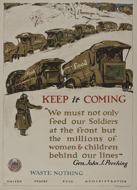 American World War I propaganda poster depicting a caravan of army trucks with "food" written on their side travelling through a snowy pass. Caption reads: "KEEP IT COMING. "We must not only feed our Soldiers at the front but the millions of women & children behind our lines\ 'Gen. John J. Pershing. Waste Nothing. United States Food Administration". No. 14. Printed by W.F. Powers Co. Litho, N.Y. 21" x 29". Small tear at bottom left margin, else near fine.