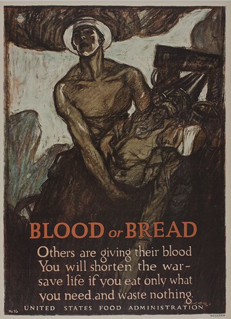 American World War I propaganda poster depicting a soldier yelling for help while holding another man in his arms. Caption reads: "BLOOD or BREAD. Others are giving their blood. You will shorten the war - save life if you eat only what you need and waste nothing. United States Food Administration". No. 16. Printed by Forbes, Boston. 21" x 29". Very light toning on edges, else near fine.