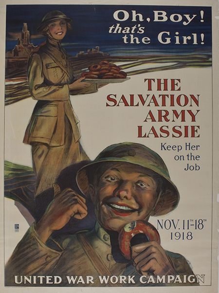 American World War I propaganda poster depicting a "doughboy" eating a doughnut, pointing at a Salvation Army "Lassie". Caption reads: "Oh Boy! That's the Girl! The Salvation Army Lassie. Keep Her on the Job. Nov. 11th-18th, 1918. United War Work Campaign". Stamped by The Committee on Public Information. Division of Pictorial Publicity. Printed by The Sackett & Wilhelms Corporation, N.Y. 40" x 30". Small tear on top edge and a few chips along right edge, else very good.