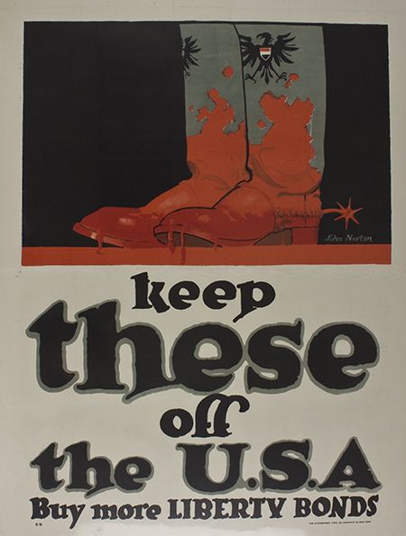 American World War I propaganda poster depicting a pair of bloody German Eagle boots with spurs. Caption reads: "Keep these off the U.S.A. Buy Liberty Bonds". Art by John Norton. Printed by The Strobridge Litho. Co., Cincinnati & New York. 40" x 30". Minor creases and usual folds, else very good.