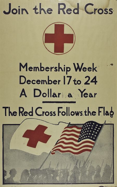 A Red Cross poster, 14" x 22" promoting membership in the Red Cross with the legend: "The Red Cross Follows the Flag". Dampstain at top, simply framed.