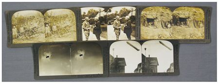 A fine group of five stereoviews most of which were published by the Keystone View Company showing various scenes along the Western Front c. 1917-18 including a view of a captured German carriage-mounted flame-thrower; a view of a German zeppelin in flight, a great shot of an American plane shooting down an observation balloon and a view of Americans encamped in the trenches. Also included is an Underwood & Underwood stereoview of generals Pershing and Joffre in consultation. All the cards bear a small bit of warping but are in otherwise very good condition.