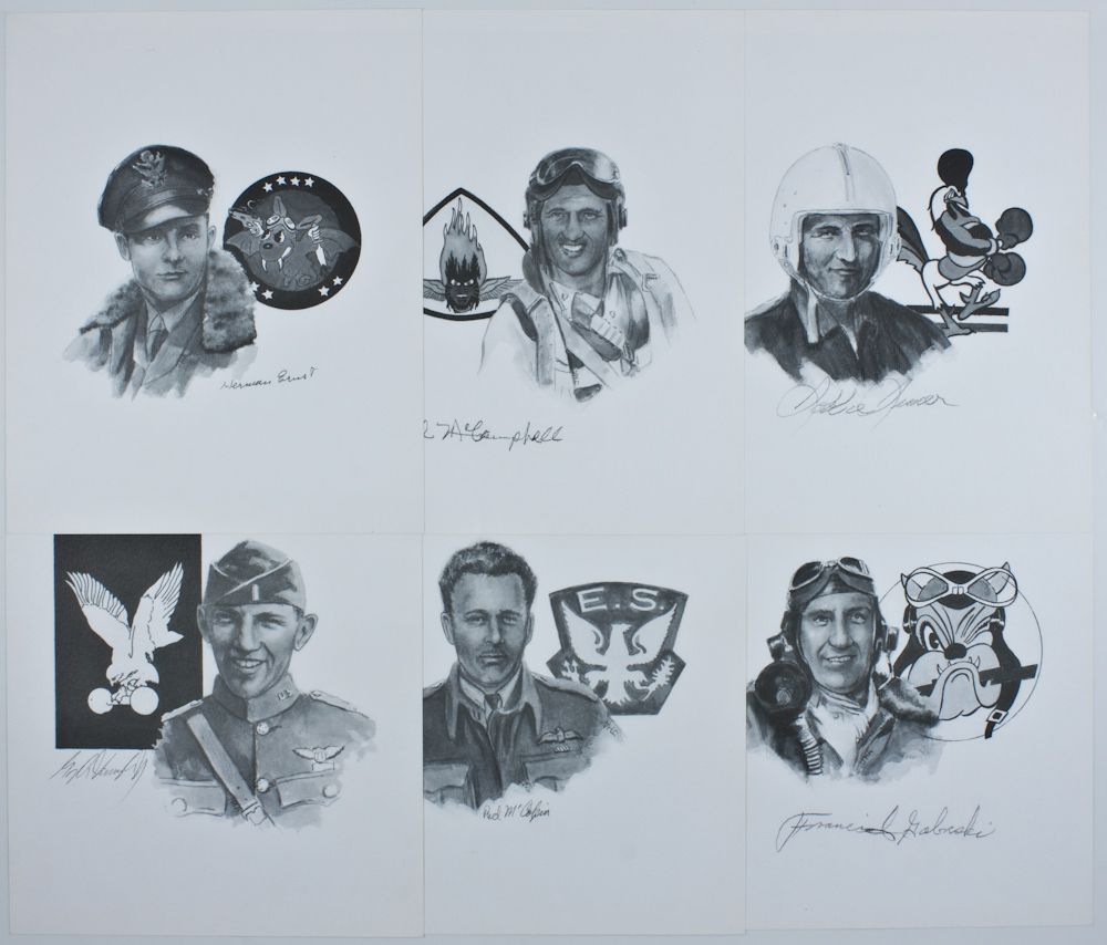 A set of six printed engravings of individual aces, 8" x 10" b/w, bust portraits with squadron's insignia behind him, signed by each in pencil. Includes: FRANCIS "GABBY" GABRESKI, ROBBIE RIMER, CAROOLL WARREN "RED" MCCOLPIN, HERMAN ERNST, DAVID MCCAMPBELL and HARLEY CAMDEN VAUGHN. Fine condition, ideal for display.