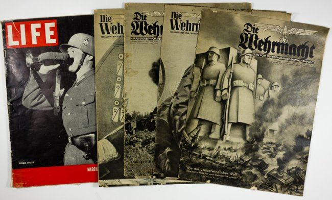 Group of eight publications, includes four copies of the German weekly "Die Wehrmacht"; October, 1934 "Army Edition" of "Hawaii as the Camera Sees It"; "The United Nations War Atlas" with Douglas MacArthur on the cover, a 1942 publication with a somewhat optimistic view; "Kaltenborn's 1942 War Atlas" shows distances between points; and Life magazine, Mar 28, 1938, shows German bugler on cover. Very good.
