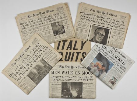 A good collection of 20 newspapers including 10 issues of the New York Times dating between 1943 and 2002 and features many choice issues from the Second World War as well as the attacks of September 11, 2001. The Times issues include: July 26, 1943 (Ouster of Mussolini); Sept. 9, 1943 (Surrender of Italy) June 7, 1944 (Normandy Landings); April 13, 1945 (Death of F.D.R.); May 2, 1945 (Death of Hitler) May 6, 1945 (V-E Day); July 21, 1969 (Apollo 11 Moon landing); Sept. 12, 2001 (World Trade Center and Pentagon attacks); Sept. 13, 2001 (aftermath); Sept. 14, 2001 (Bush proclaims "POLICY OF 'ENDING' STATES THAT BACK TERROR..."); Sept. 15, 2001 (Bush visit to New York); Sept. 16, 2001 (Military preparations); Sept. 17, 2001; Sept. 18, 2001 (Stock market drops 7%); Oct. 8, 2001 (First U.S. strikes on Afghanistan); Sept. 11, 2002 (partial issue on first anniversary of 9-11 attacks). The lot also includes three other papers including New York Post, from Sept. 3, 1943 ("ITALY QUITS"); the New York Daily News from Sept. 11, 2002 ("CODE ORANGE"); and the Stuyvesant High School Spectator (Fall 2001) covering the downtown school's reaction to the events of September 11 distributed with the New York Times Issues bear minor tear and the older issues have the expected light to moderate toning, else very good condition. Together, twenty pieces.