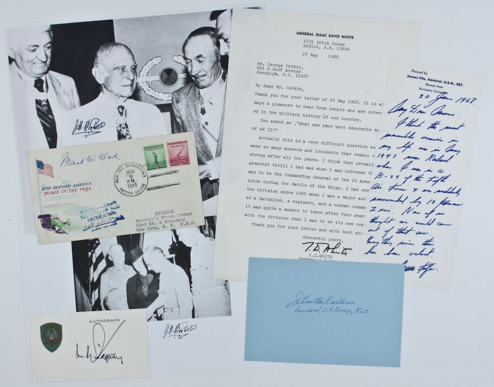 A group of seven pieces by notable military leaders in various formats (noted), includes: MATTHEW RIDGWAY (signature on embossed autograph card); JAMES FIFE (A.L.S. 1968, in part: "...the most memorable occasion in my life was in Guam 1943...when I was in a B-24 of the Fifth Air Force & was suddenly surrounded by 12 Japanese Zeros. None of us thought we would come out of that one...); MARK W. CLARK (signature on a FDC from French Guiana, cancelled Nov. 7, 1941); J. LAWTON COLLINS (signature on a card); ISAAC DAVIS WHITE (T.L.S. 1968, in part: "...probably the greatest thrill I had was when I was informed that I was to be Commanding General of the 2d Armored Division during the Battle of the Bulge"), and JAMES H. DOOLITTLE, two 8" x 10" b/w S.Ps. being repros of vintage image, each signed with an old age signature. Very good.