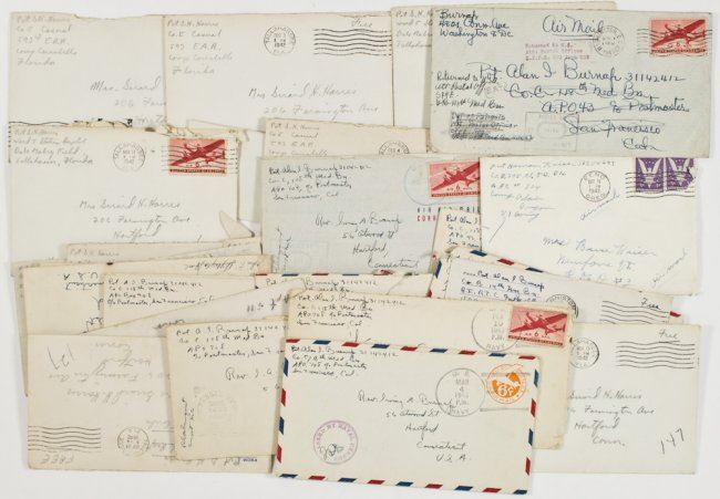 Grouping of 12 war-date letters and covers from Pvt. Girard H. Harris, 593rd Engineers Amphibious Reg., covering his training at Camp Carrabelle (near Panama City, FL), Aug 7-Dec. 7, 1942, most 4pp. 8vo. The content of the letters, along with the fact that Harris has remained behind while his regiment has shipped-out to California, leads us to believe that he may have been in line for a Section 8 discharge, i.e. mental instability. In part: "...Received instructions on what to do before we use the boats...we were preparing for inspection...the general takes the rifle from you, looks it over...then throws it back at you...my knees were knocking...he spotted your two pictures behind my bunk...He said 'You have a very lovely wife'...[at base hospital] we have a fellow that just came in who thinks he's Napoleon. He looks it too. Something tells me I'm in the right ward...the fellow that tried to cut his wrists was put in another ward...he dove through the window and ran down the road...my outfit is out on Catalina Island...Carrabelle has been condemned but the Army has overruled it...[he encloses a miniature pair of panties and promises to replace them with a larger pair when he returns home]...There is a possibility I might be coming home...I haven't eaten in a week...Quite a few boys didn't come back from town last night...when they showed up this morning they were all battered...someone was beating them up and rolling them of their money...it happens every pay day...the men gambled again...a lot of them have gone broke...they were betting as high as $40 a hand...I never saw so much money floating around...bombs, torpedoes and mines might be found on the shores. We were told not to touch them or pick up any fragments...Tomorrow I should know if I'll get home for Christmas. Of course, a lot may have to depend on the outcome of my session with the Board...the Medical Board won't meet again ...until after Christmas...". Sold with an unrelated soldier's letter, 4pp. 8vo., Camp Adair, OR, Oct. 13, 1943 enclosing three photos of a young lady and noting: "...I don't know what to think about Dot. But she sure in hell seems a little wackie to me. You ought to see some of her letters...Here is some pictures I got from Dot...You can do anything you wish [with] them. Burn them up or throw them away or do what you want with them...". Also with nine war-date A.L.S.'s of Pvt. Alan I. Burnap, each 2pp. or more, all written from the South Pacific, 1942-43 with covers but as Burnap was very careful about content due to censorship restrictions, the content is mundane at best. 22 pcs.