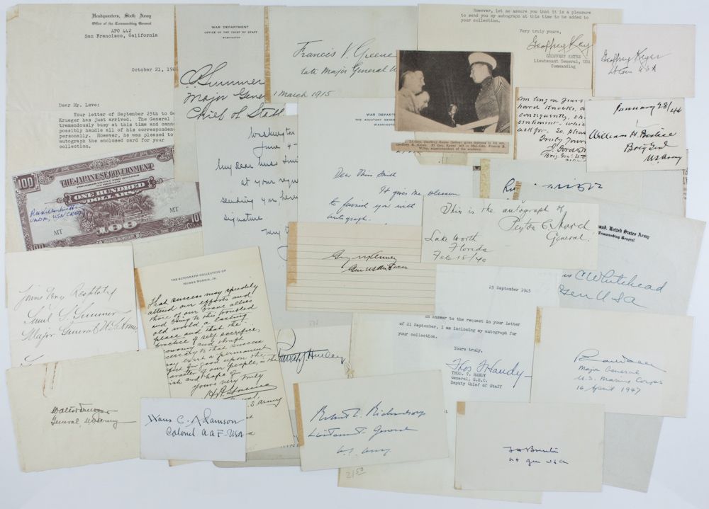 A large group of over 20 signatures of World War II generals, in various formats but mostly signed cards and letters, includes: H. A. GREENE, HANS C. ADAMSON, ROBERT E. RICHARDSON, PATRICK J. HURLEY, GEOFFREY KEYES (2), JOHN H. CRICHTON, CHARLES PELOT SUMMERALL, FRANCIS V. GREENE, PEYTON C. MARCH, WILLIAM H. BISBEE, ENNIS C. WHITEHEAD, THOMAS T. HANDY, WALTER KRUEGER, and many more not identified by us. Condition varies but overall good to very good.