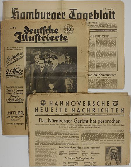 A group of three Germans newspapers, the first Deutsche Illustrierte, Apr. 4, 1933, 20pp. sm. folio, includes a two-page report about the life and death of Horst Wessel and a four-page spread on the meeting of Mar. 21, 1933, heavily illustrated. Along with a copy of the Hannoversche Neueste Nachrichten, Oct. 2, 1946, 6pp. folio. The front page news includes the judgments made at the Nurnberg Trials, listing all 22 defendents and their photographs within. Also includes a verbatim transcript of Hitler's last will and testament, with an addendum by Goebbels.With a third newspaper, Hambuerger Tageblatt, Oct. 20, 1943, war content. Three pieces, general wear and toning consistent with age.