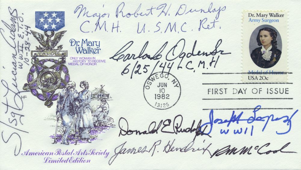 A FDC honoring Dr. Mary Walker, the only woman to have been awarded the Medal of Honor, canceled Oswego, NY, June 10, 1982, boldly signed by seven other winners including: ROERT H. DUNLAP, CARLOS C. OGDEN, JOSEPH LOPEZ, DONALD E. RUDOLPH, R. M . MCCOOL, JAMES R. HENDRICK and LUCIAN ADAMS. Very good condition.