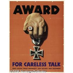 <B>Award For Careless Talk (U.S. Government Printing Office, 1944)</B></I> WW II Poster (28" X 37"). A whole series of posters was devoted to the theme of not talking about information obtained at one's place of work or from V Mail received from troops. Steven Dohanos, a noted illustrator famous for his Saturday Evening Post covers, was responsible for several of the "Don't Talk" set of posters. This is considered one of the more graphically powerful. Fine/Very Fine condition.