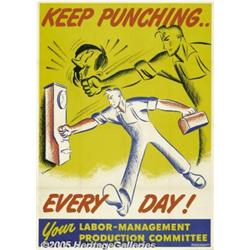 <B>Keep Punching Every Day (U.S. Government Printing Office, 1943)</B></I> WW II Poster (28" X 40"). Cartoonish imagery was especially popular with incentive posters such as this. A huge number of such posters were produced in a wide array of formats and the walls of factories were covered with layers of them. Very Fine condition.