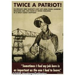 <B>Twice a Patriot (U.S. Government Printing Office, 1944)</B></I> WW II Poster (28" X 40"). This poster has several interesting aspects. First, very few African-Americans were featured in World War II propaganda. The armed forces were still segregated and many Southern states refused to post such images. Secondly, the photographic nature of the poster is not common and finally, the theme of wounded soldiers working on the home front is very uncommon. Very Fine condition.