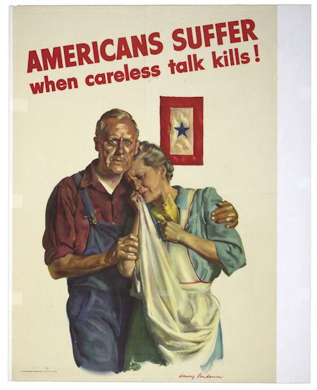An American-issued World War II propaganda poster, 14" x 20" color, showing a farmer clutching his tearful wife who bears a Western Union telegram in her hand, with the large red-lettered legend: "AMERICANS SUFFER when careless talk kills!" Fine.