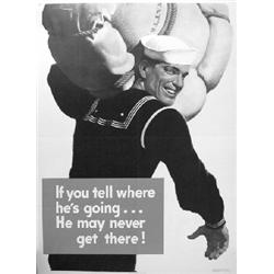 <b>1141. WORLD WAR II PROPAGANDA POSTER </b>American-issued World War II propaganda poster, 20" x 28" color, shows an American sailor with a large bundle on his shoulder, smiling as he looks behind him, with the legend reading: "If you tell where he's going...He may never get there!" Framed, fine. <b>$200-300</b>