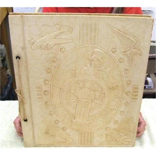 This is a wonderful World War II collectible and I think quite scarce. The scrapbook is unused and the hardcover is embossed (Raised) with Uncle Sam at the ship's wheel in the center with stars all around the oval and with a plane, eagle, ship and artillary in each corner. It is an ivory color and in very good condition. I just bought this at a local sale where the owner is now 101.