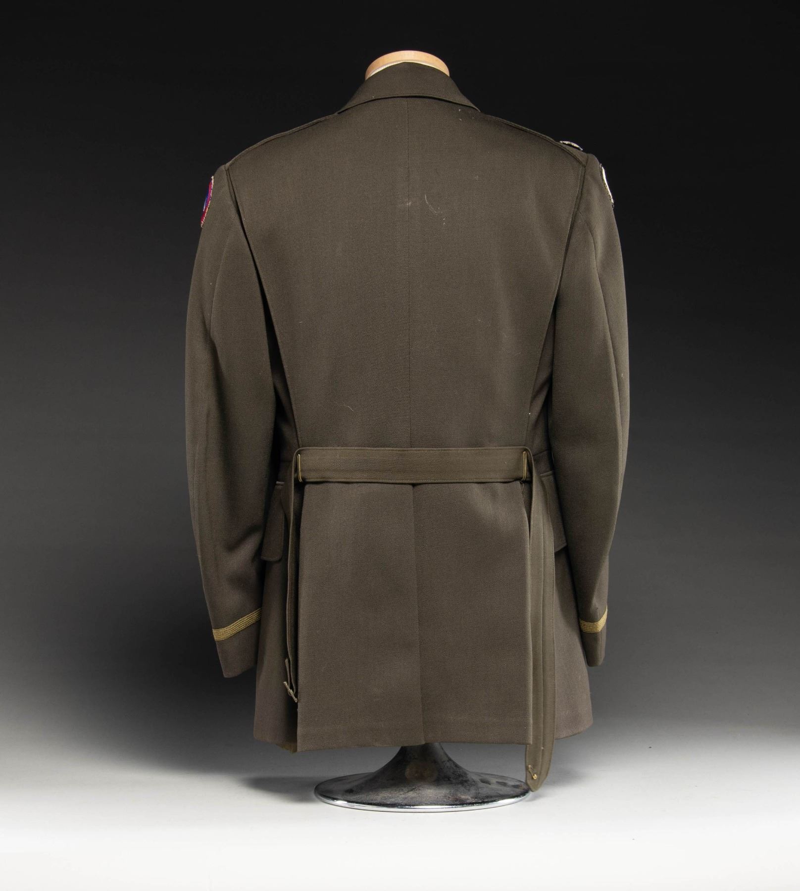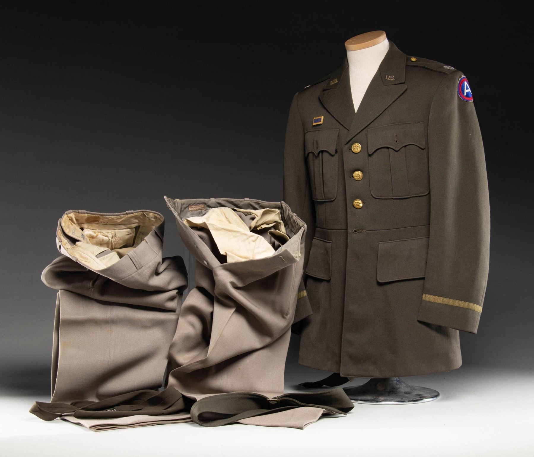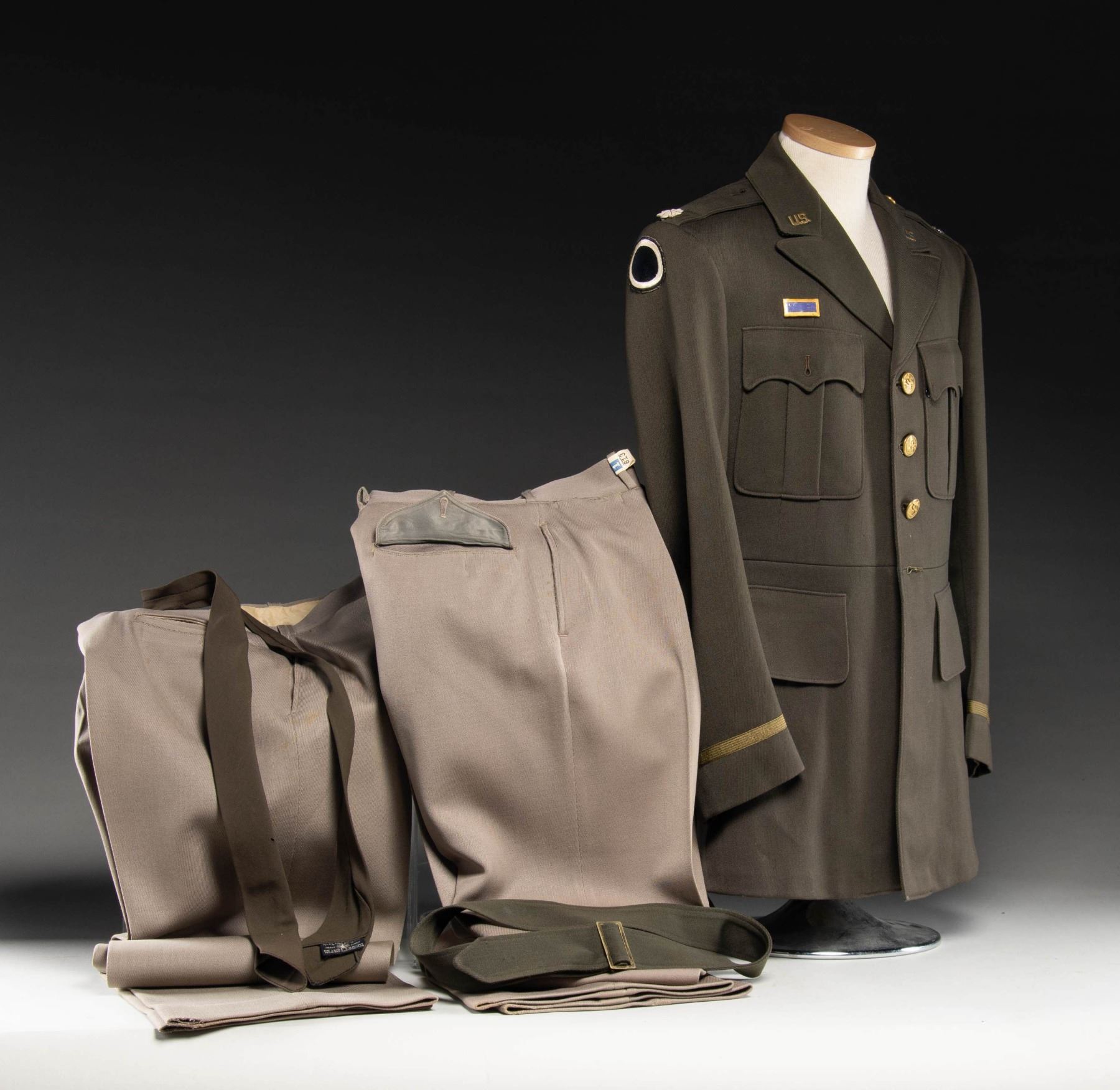 3RD US ARMY PATCH. Uniform comes with 2 sets of pinkish taupe trousers. OD green tie, OD green belt & OD green coat. Coat has 3 Army Corp of Engineers buttons on the front. Lieutenant Colonel oak leaves, & shoulder straps (one missing a button). CONDITION: uniform in good overall condition showing small holes, fraying of stitching & sm. stitch repairs. 1 button having safety pin retainer. Inside of coat has some tears and seam openings. Belt is missing buckle. (02-24897/MD). NON-GUN. $150-300.