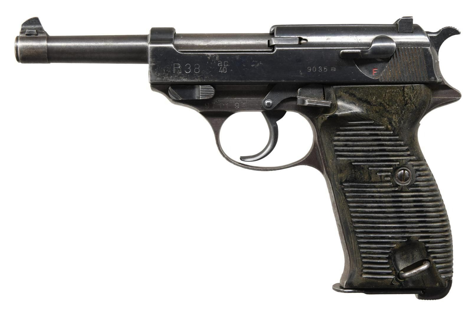 Cal. 9mm L. S# 9711g. Bbl 4 7/8". Standard configuration P.38 manufactured at the Walther arsenal during World War II. Slide bears standard markings, Walther's manufacturer code and the year of manufacture "ac/40", with the right side bearing an Eagle/359 waffenamt on either side of an eagle firing proof. Slide exhibits a proper high polish blued finish, with the frame and barrel exhibiting a later war dull blue finish, Frame is mounted with 2 piece grooved brown pressed resin grips. Matching numbers are present on the frame, barrel, and locking block. MAGS: 1 8 rnd. CONDITION: metal components exhibit wear and scattered spots of surface oxidation overall. Bore exhibits pitting and fair rifling throughout. Grips show some scattered marks from storage and handling, but are otherwise sturdy and serviceable. (23-1863/MLW). CURIO. $500-800.
