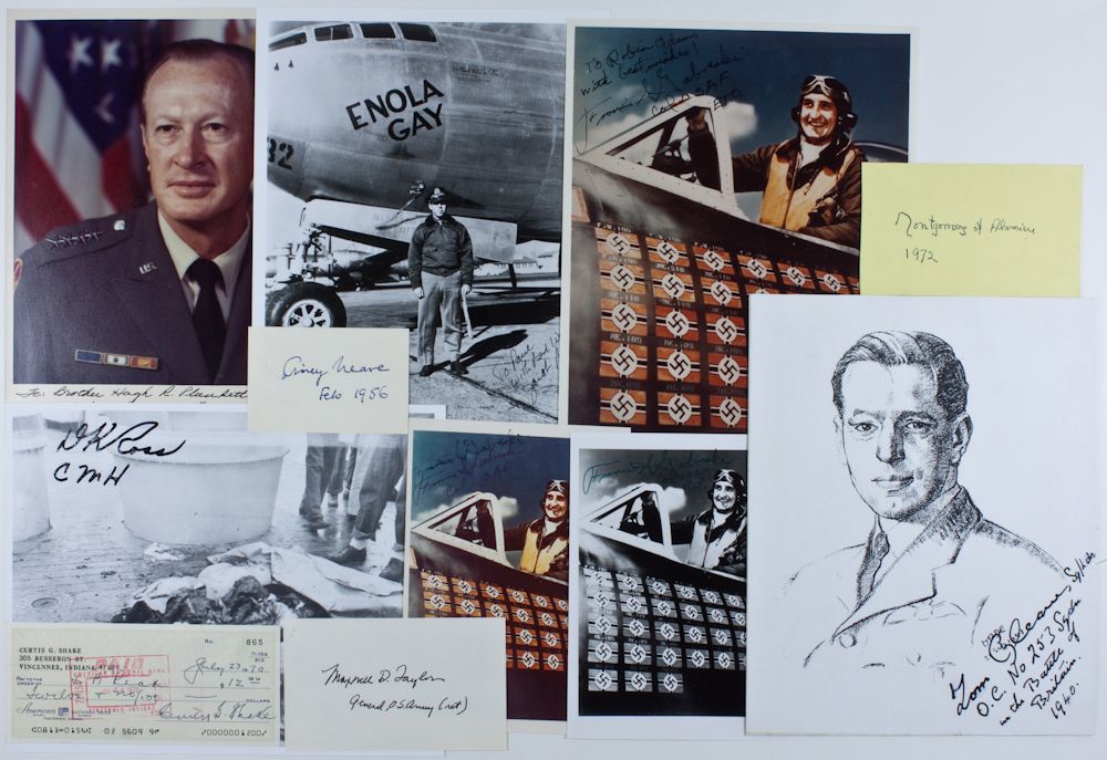 A great group of 11 pieces by prominent World War II figures, includes: FRANCIS "GABBY" GABRESKI, three S.P.s, two being 5" x 7" and the other 8" x 10", each showing Gabby in his Nazi flag-festooned bomber; TOM GLEAVE, printed drawing of Gleave in head and shoulders, boldly signed at lower right adding "Sq/Ldr O. C. No 253 Sqdn in the Battle of Britain 1940"; DONALD K. ROSS, S.P. 10" x 8" b/w, a grisly shot showing mangled bodies from Pearl Harbor; BERNARD LAW MONTGOMERY, signature on a yellow card "Montgomery of Alamein"; JACOB BESER, S.P. 8" x 10" b/w, a reprint of an image showing Beser standing in front of the Enola Gay; MAXWELL D. TAYLOR, signature on a small card; AIREY NEAVE, signature on a small card; CURTIS G. SHAKE, Judge at Nuremberg, signed check from 1970, and one other S.P. of a general not identified by us. 11 items, very good.