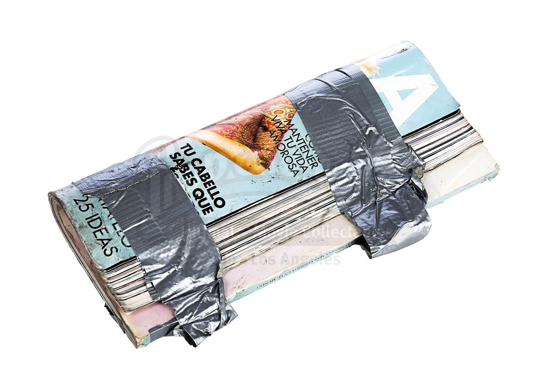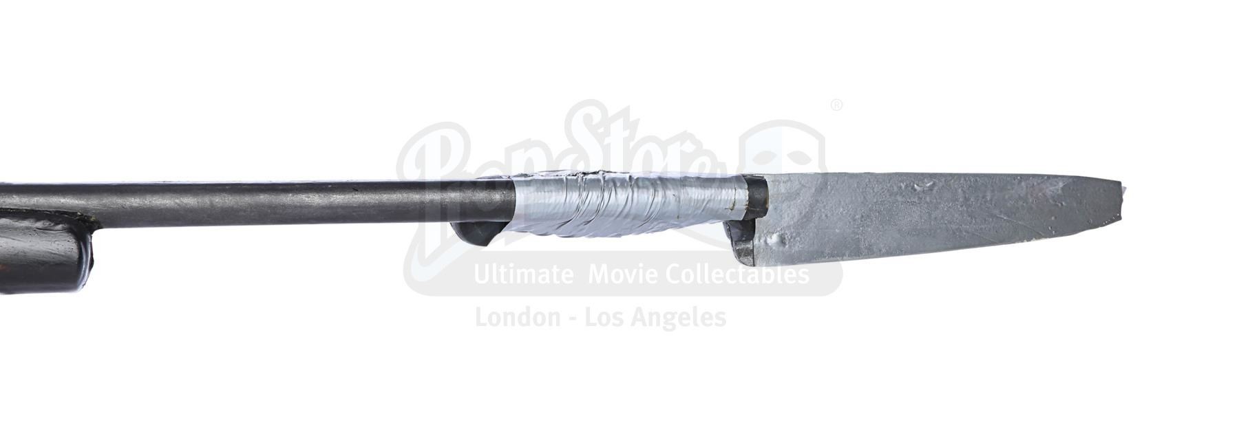 The weapon is a stunt version of a Remington Model 700 rifle. It is made of foam rubber and hand-painted with a realistic finish. The knife, made of resin with a thin foam-board blade, has been gaffer-taped to the barrel. The magazine is a copy of the Spanish-language publication Starla and is also covered in duct tape. The gun shows some wear from production use, including some areas where the foam has cracked, most notably at the base of the sight. The tip of the knife has snapped off, revealing the foam underneath. Dimensions (rifle): 121 cm x 8.5 cm x 17 cm (47 1/2 " x 3 1/2" x 6 3/4"); (magazine): 28.5 cm x 13 cm x 4 cm (11 1/4" x 5" x 1 1/2")