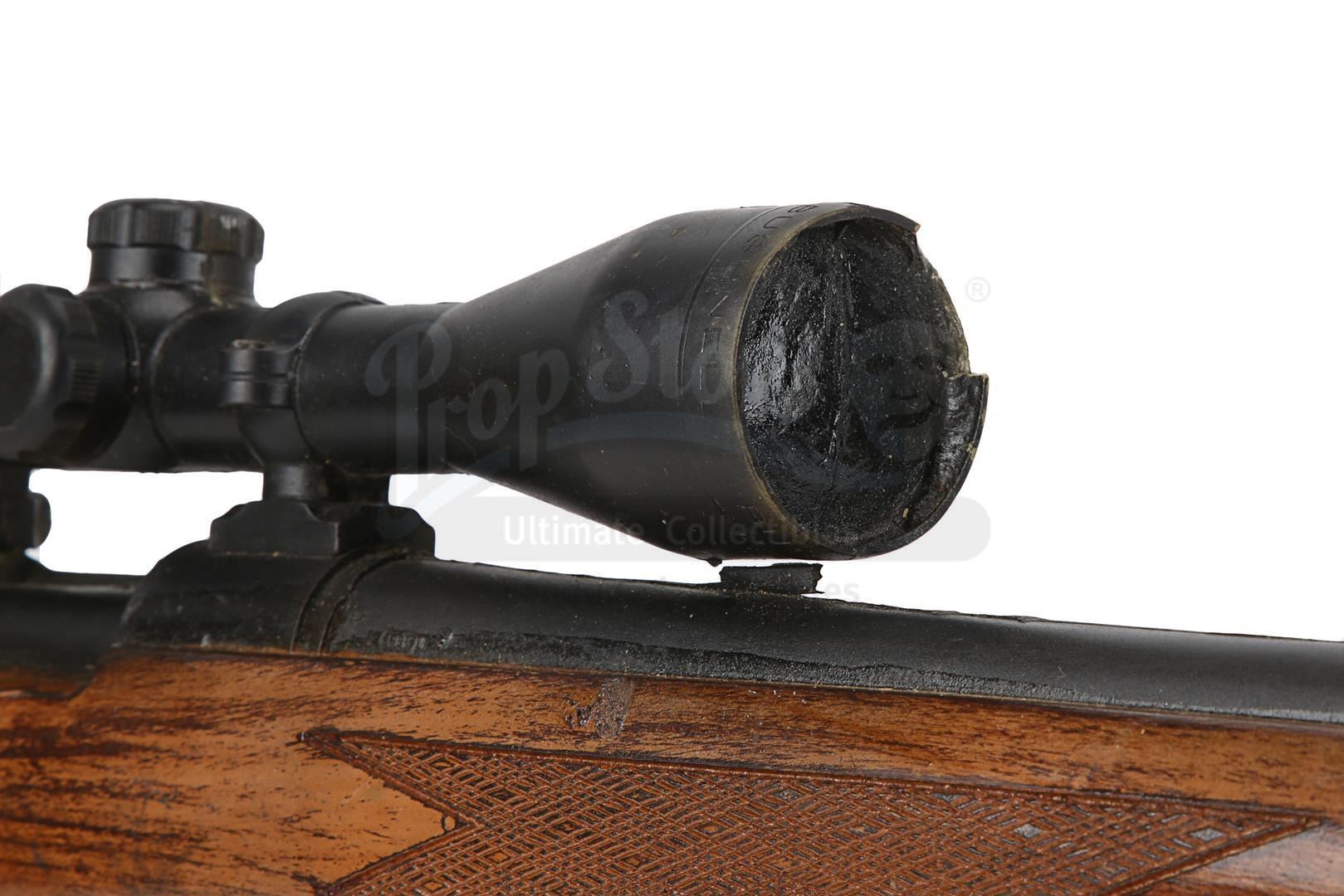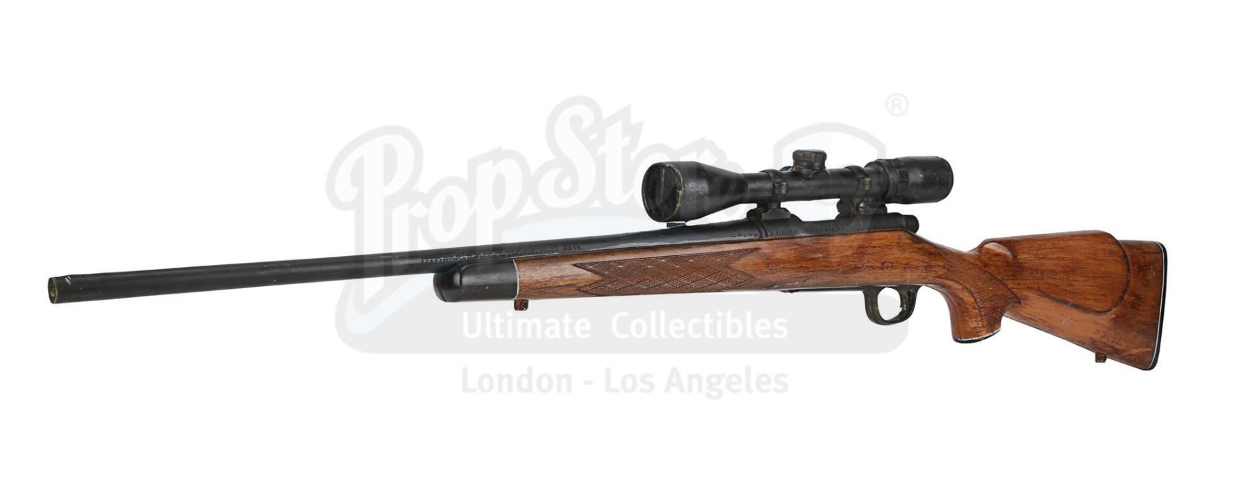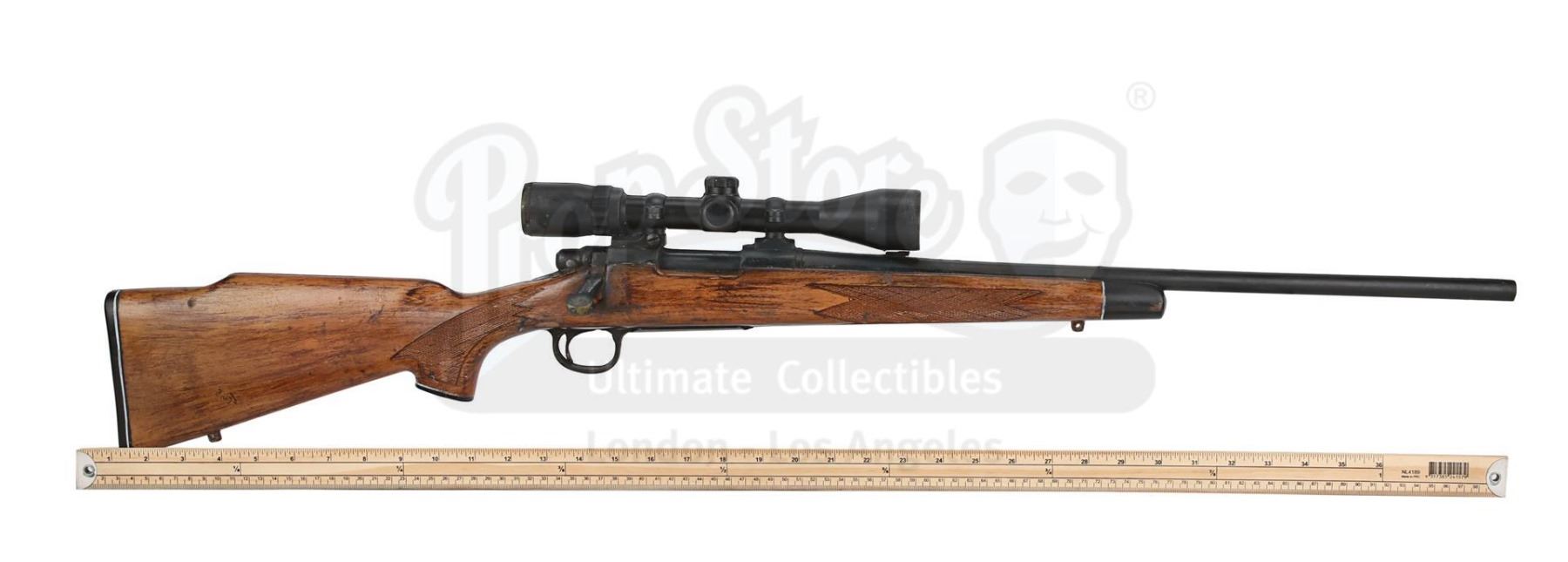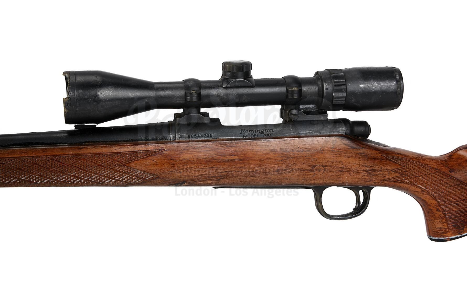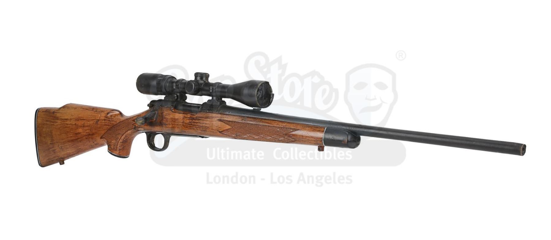 The weapon is a stunt version of a Remington Model 700 rifle, made of hardened rubber and hand-painted to have a realistic finish. It shows some wear from production use, including scuffing, scratches and wear to the paintwork. Part of the rubber has cracked around the front of the sight, there is some adhesive residue, and there is a small amount of silver paint transference on the buttstock. Dimensions: 105 cm x 8.5 cm x 17 cm (41 1/4" x 3 1/2" x 6 3/4")