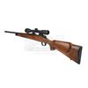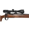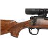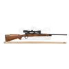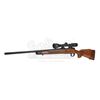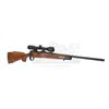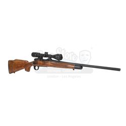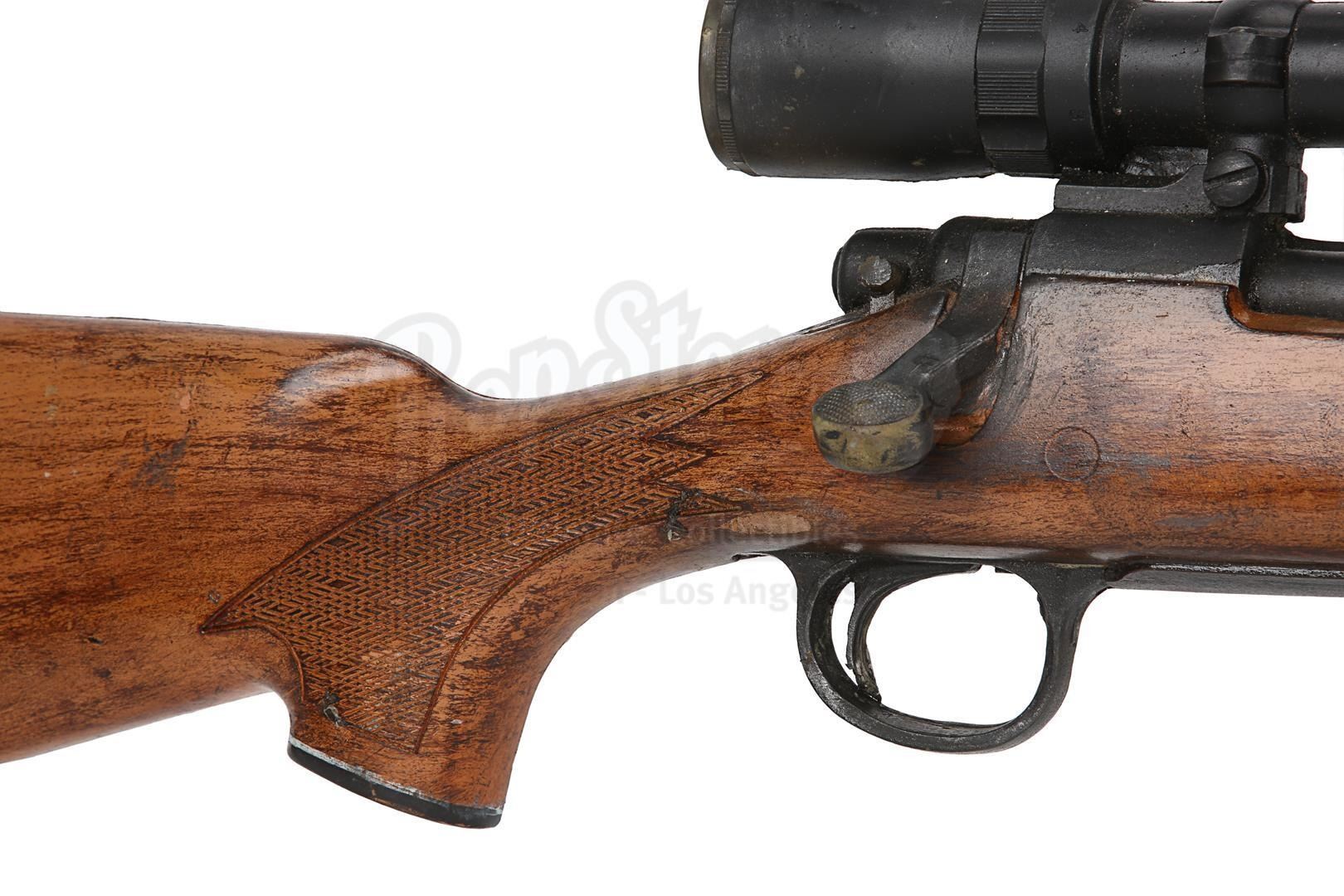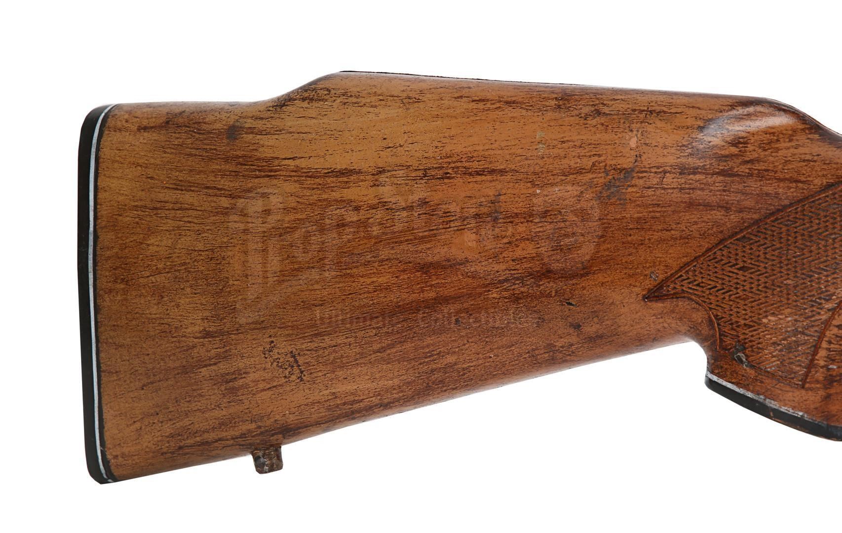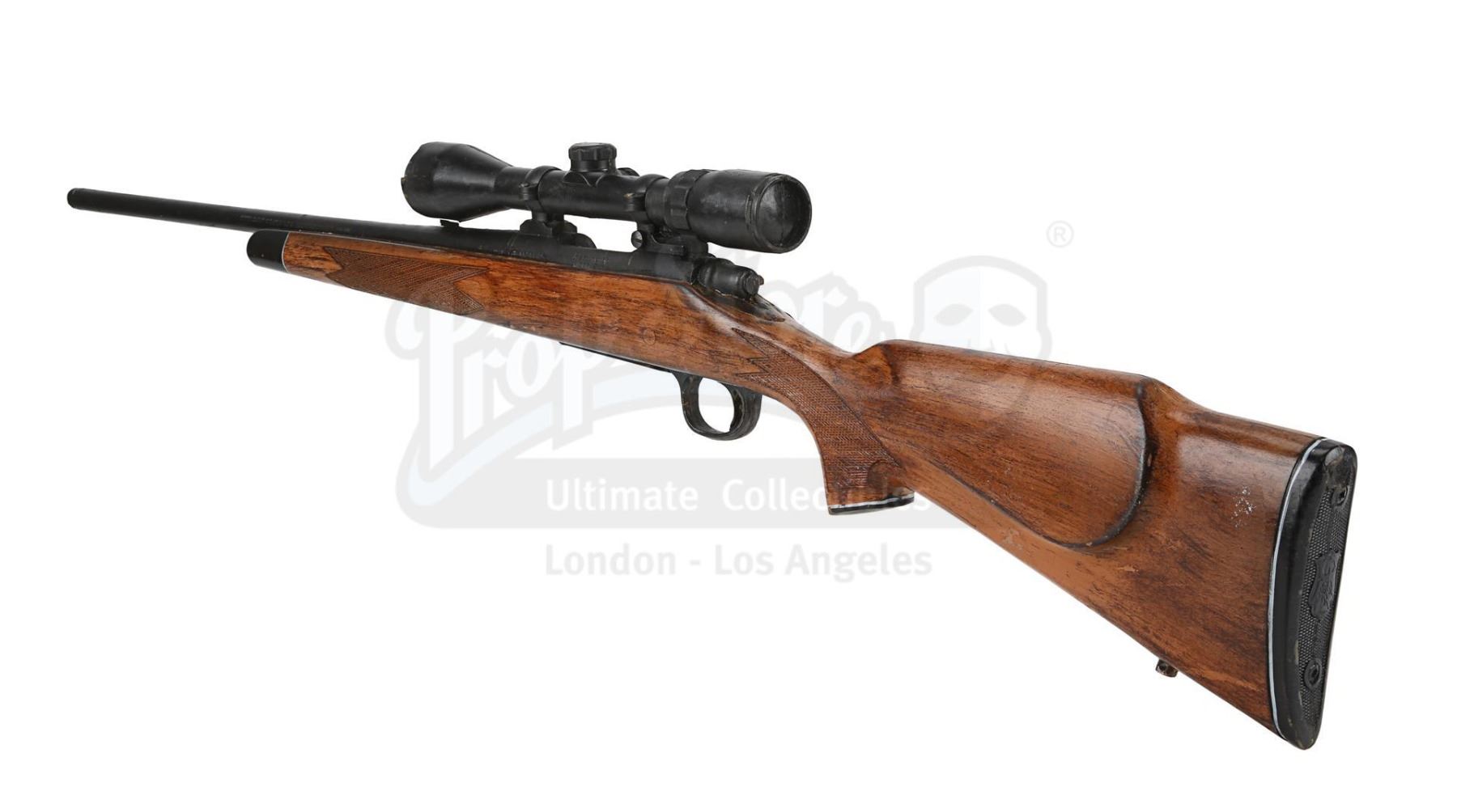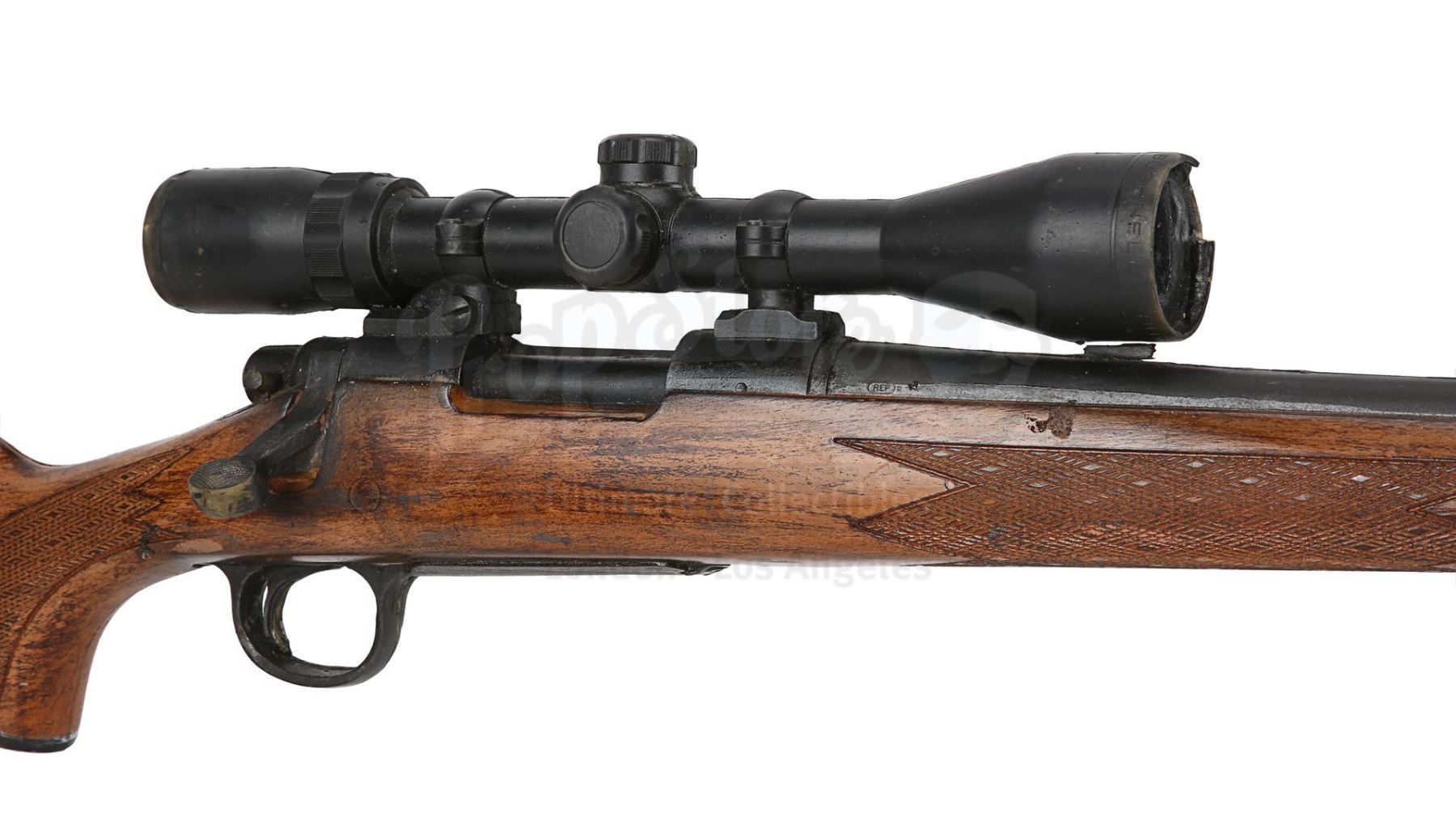 The weapon is a stunt version of a Remington Model 700 rifle, made of hardened rubber and hand-painted to have a realistic finish. It shows some wear from production use, including scuffing, scratches and wear to the paintwork. Part of the rubber has cracked around the front of the sight, there is some adhesive residue, and there is a small amount of silver paint transference on the buttstock. Dimensions: 105 cm x 8.5 cm x 17 cm (41 1/4" x 3 1/2" x 6 3/4")